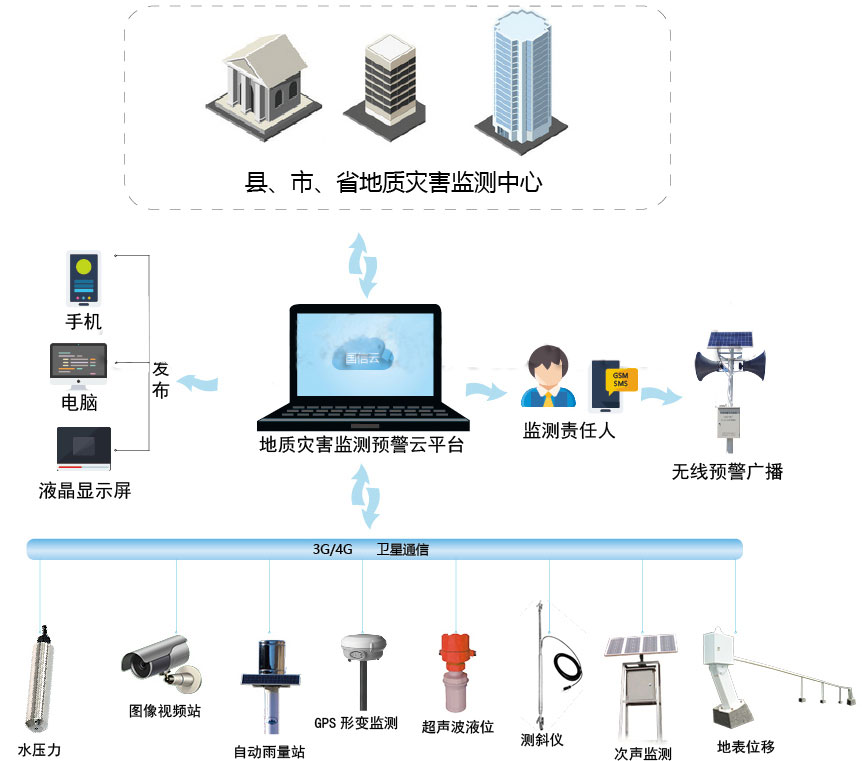地質(zhì)災(zāi)害監(jiān)測預(yù)警系統(tǒng) 是結(jié)合專業(yè)地質(zhì)災(zāi)害監(jiān)測設(shè)備和數(shù)據(jù)分析技術(shù),形成地質(zhì)災(zāi)害監(jiān)測與預(yù)警的立體解決方案。該系統(tǒng)通過對監(jiān)測點的監(jiān)測數(shù)據(jù)遠(yuǎn)程采集,實現(xiàn)了監(jiān)測數(shù)據(jù)實時反饋到監(jiān)控中心,監(jiān)控中心服務(wù)器通過分析數(shù)據(jù),將預(yù)警信息發(fā)送給相應(yīng)負(fù)責(zé)的責(zé)任人、責(zé)任人根據(jù)應(yīng)急預(yù)案及時下達(dá)指令,通過廣播通知受威脅對象快速撤離。